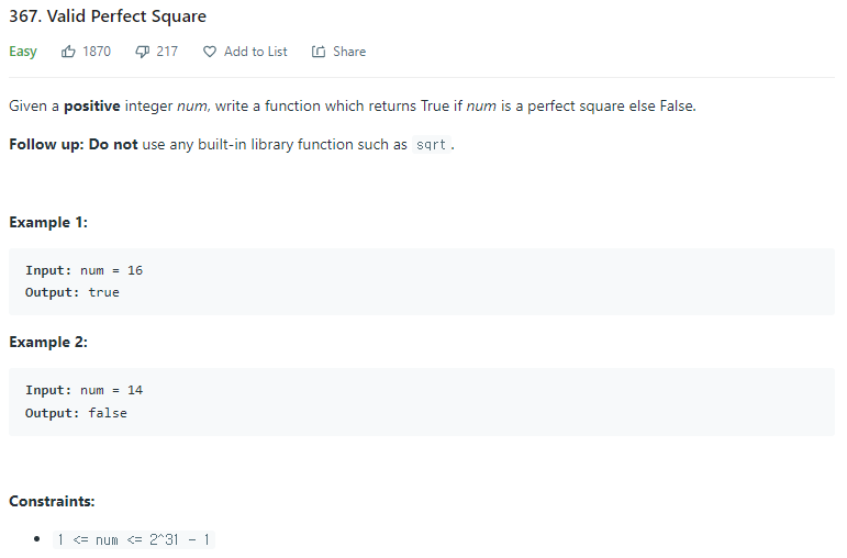 문제 출처:https://leetcode.com/problems/valid-perfect-square/