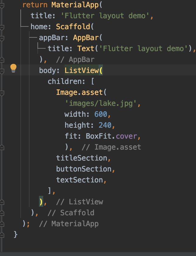 먼저, 타이틀 영역의 좌측에 column을 만듭니다. MyApp 클래스의 build() 메소드 가장 위에 다음의 코드를 추가합니다