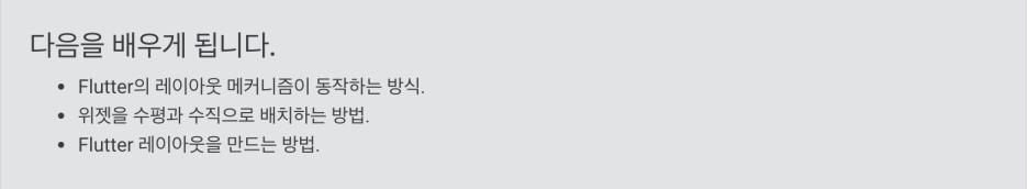 레이아웃 메커니즘을 이해하기 위한 “큰 그림”을 알고싶으신 경우라면, Flutter’s approach to layout을 찾아보세요.