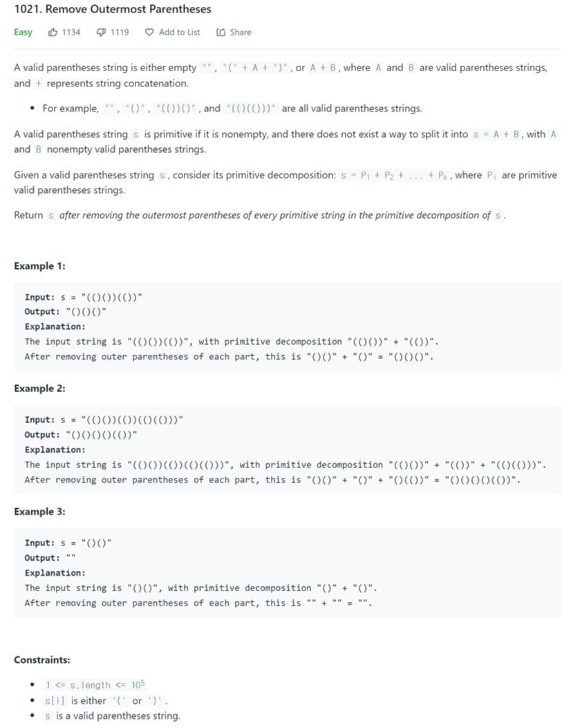문제 출처:https://leetcode.com/problems/remove-outermost-parentheses/