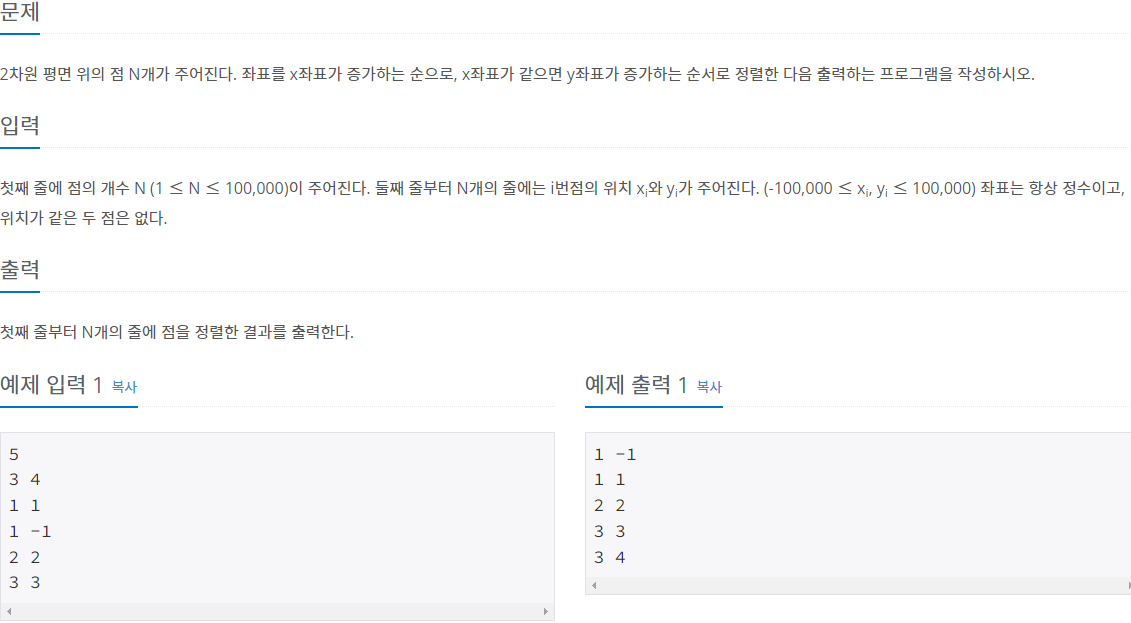 해당 문제는 인풋으로 주어진 여러 좌표들을 sort하면 되는 문제입니다.
