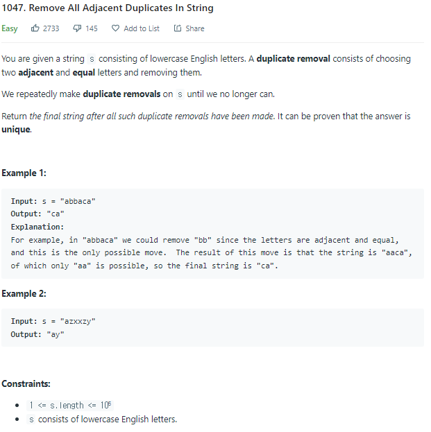 문제 출처:https://leetcode.com/problems/remove-all-adjacent-duplicates-in-string/
