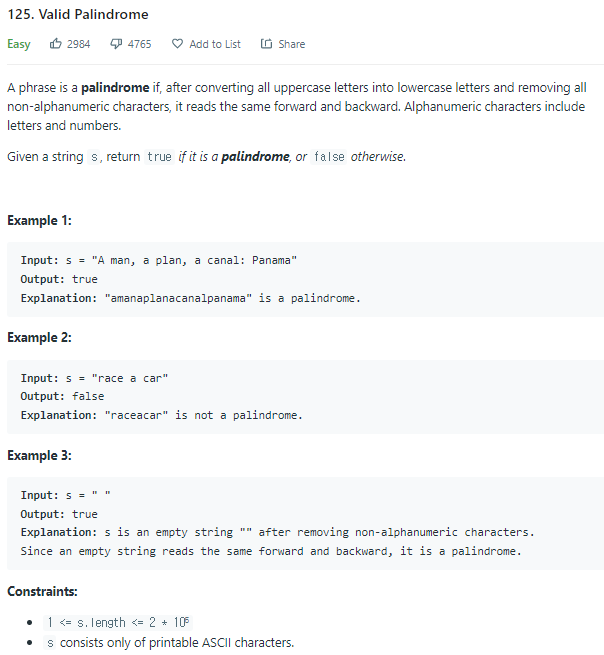 문제 출처:https://leetcode.com/problems/valid-palindrome/