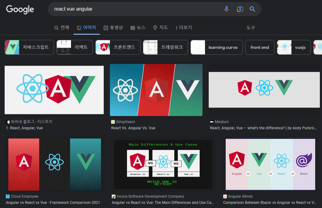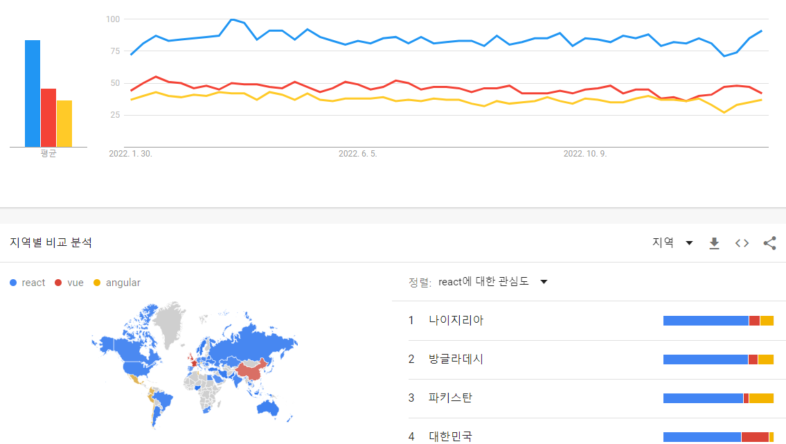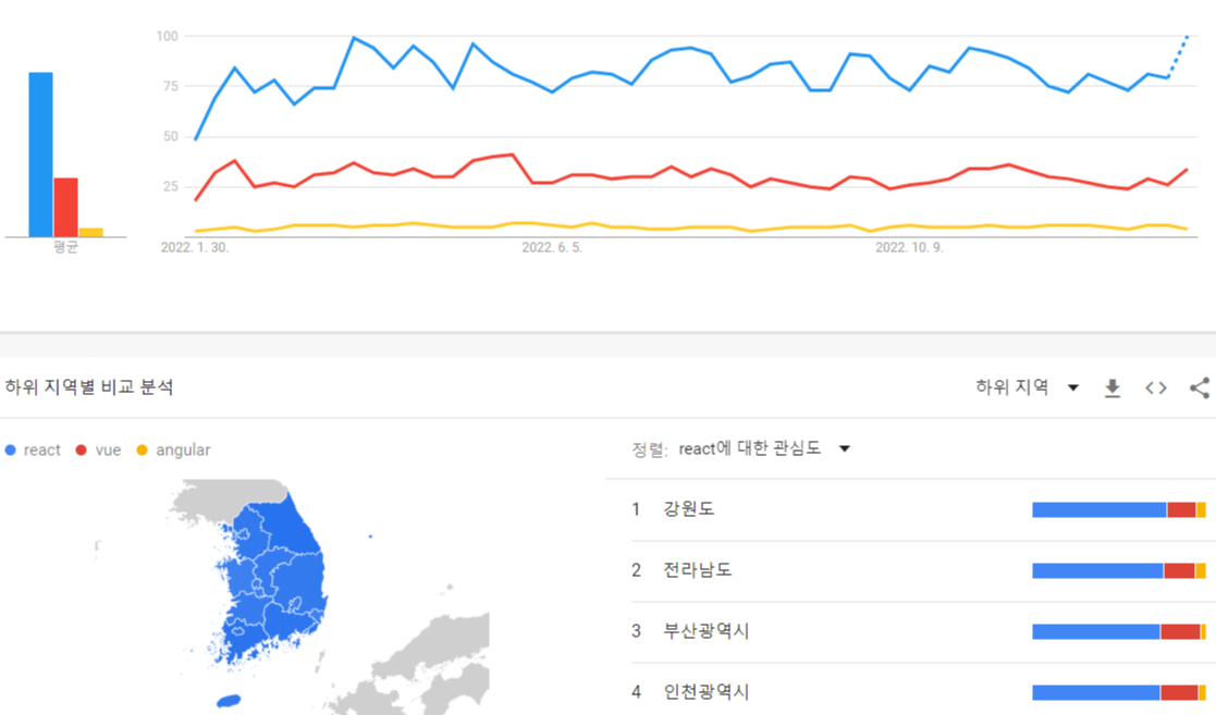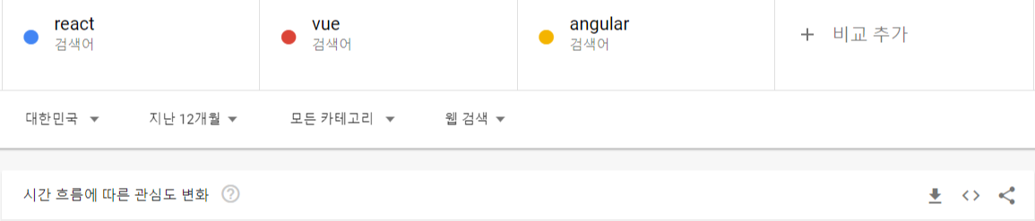 이런 식으로 front-end에 입문하고자 하는 많은 사람들은 무엇으로 공부해야하는지 고민하고 어떤 것이 trend가 될 것인지 고민하곤 한다. 그래서 나도 얼마나 많은 사람들이 관심을 가지고 있는지 알아보기 위해 Google trends에 검색해봤다.