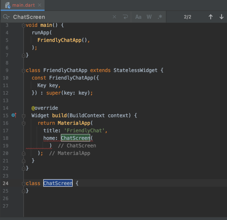 FriendlyChatApp 클래스 밑에, 27번줄 주위에 stless typing을 시작합니다. 편집기에서 stateless 위젯을 만들 것인지 묻습니다. 승인하려면 Return을 누릅니다. 반복 사용 코드가 나타나고 stateless 위젯의 이름을 입력할 수 있는 커서가 배치됩니다. ChatScreen을 입력합니다.