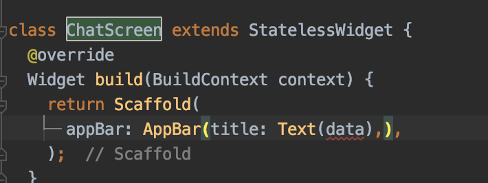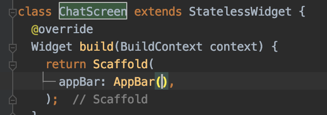 5. Start typing ChatScreen, and select ChatScreen() from the popup. (Choose the ChatScreen entry that is marked with an equal sign inside the yellow circle. This gives you a class with empty parentheses, rather than a constant.)