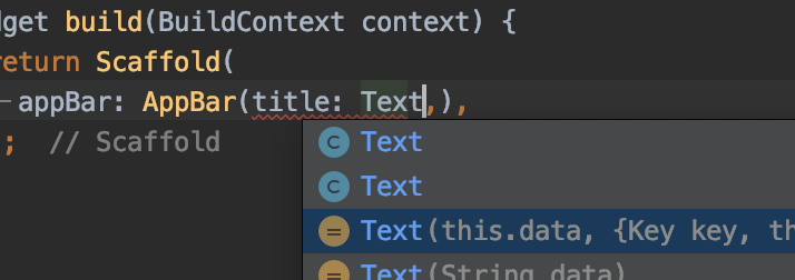 appBar: 후에 AppBar 입력을 시작하고 팝업에서 AppBar 클래스를 선택합니다.