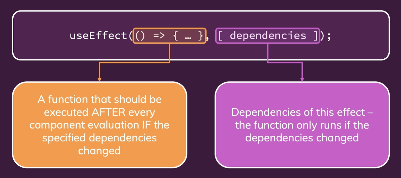 간단히 말해서, useEffect() 함수에서 사용하는 모든 "것들"을 추가해야 한다. component(또는 일부 상위 component)가 다시 렌더링 되어 이러한 "것들"이 변경될 수 있는 경우에 component 함수에 정의된 변수나 state, props, 함수는 의존성에 포함되어야 한다.