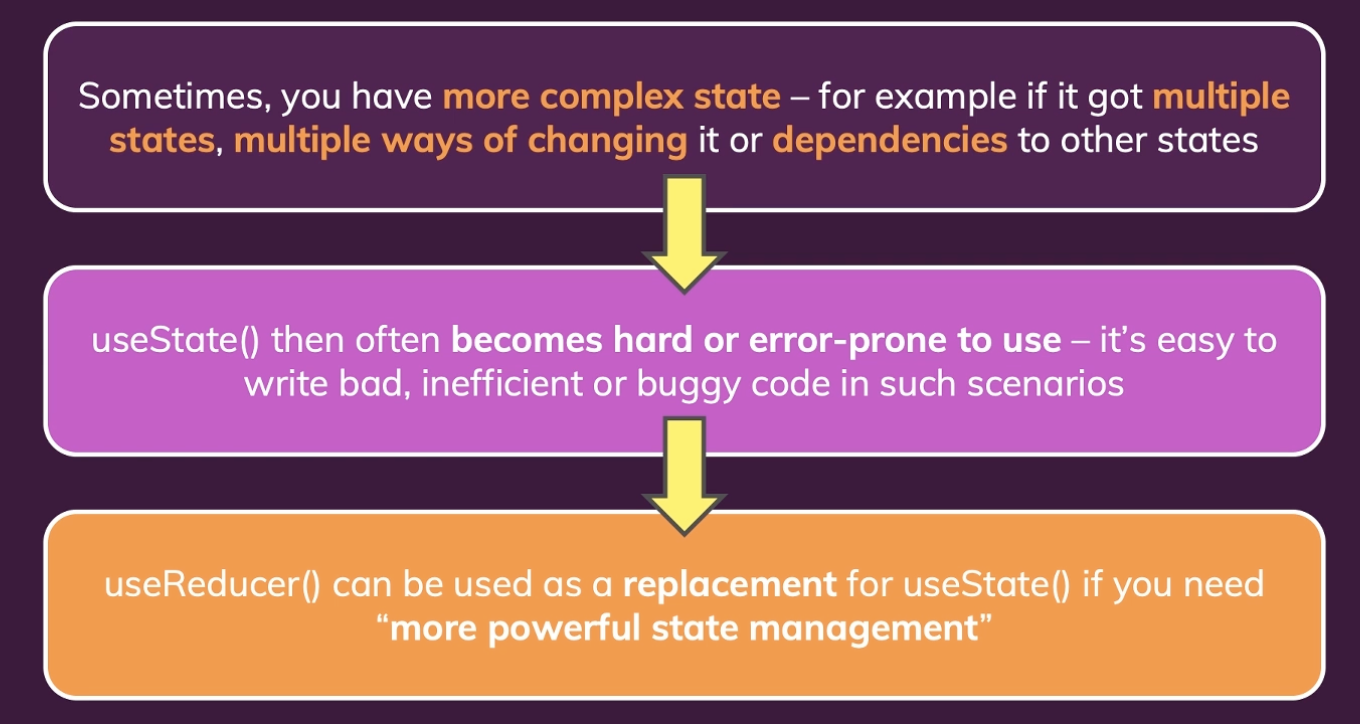 하지만 state가 더 복잡해지고 커진다면, 또한 여러 가지 관련된 state들이 서로 결합된 경우라면 useReducer()도 고려할만 하다.