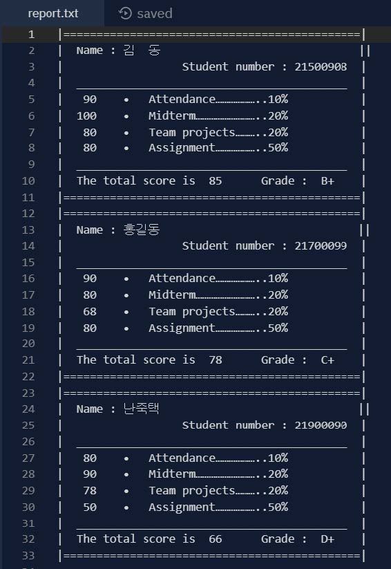 - This program calculates the scores of OSSL classes and prints out the scores and credits in a report format.