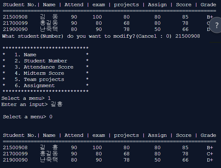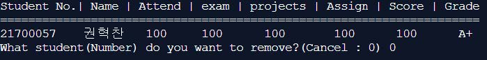 Enter the student’s numbers that you want to delete.If an invalid value has been entered, it will continue to ask to put correct numbers.