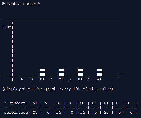 Only the currently stored grade of the linked list is extracted and represented as percentages. Create a simple bar chart using the percent array created. Afterwards, the percentages for each grade are printed together.
