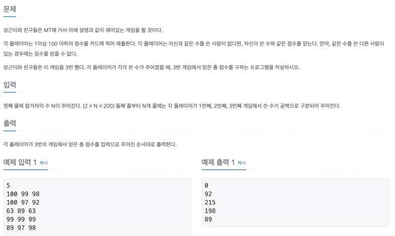 첫째 줄에 참가자의 수 N이 주어진다. (2 ≤ N ≤ 200) 둘째 줄부터 N개 줄에는 각 플레이어가 1번째, 2번째, 3번째 게임에서 쓴 수가 공백으로 구분되어 주어진다.