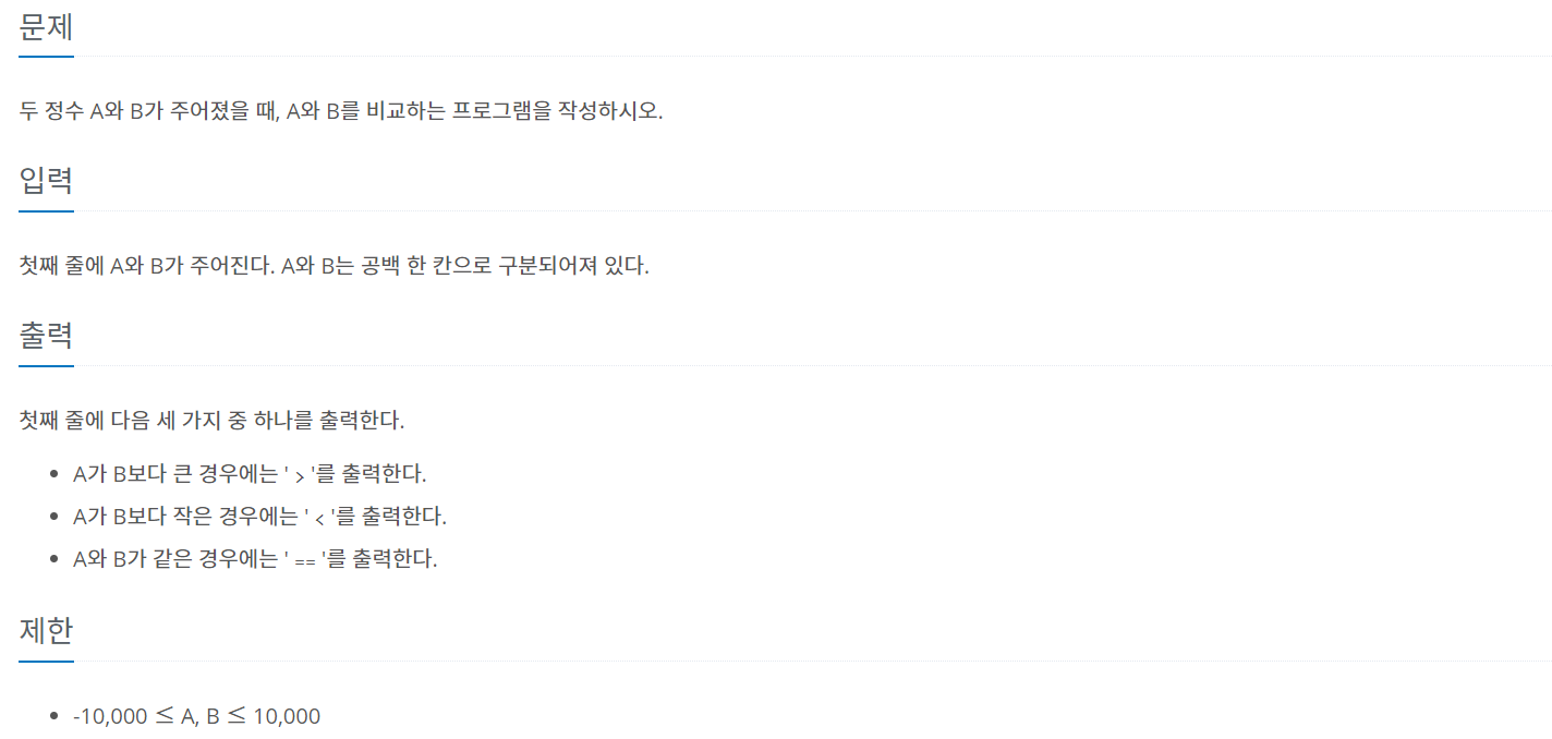 두 정수 A와 B가 주어졌을 때, A와 B를 비교하는 프로그램을 작성하시오.