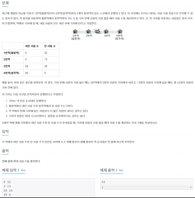 이 문제는 타고 내릴 때의 사람 수를 세어야하며, 그 중에 maximum을 찾아야합니다. 큰 무리없이 풀 수 있었습니다.